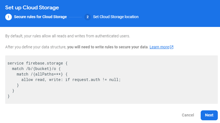 We’ll change the storage rules so that only authenticated users can upload files to the storage bucket. Select the Rules tab.